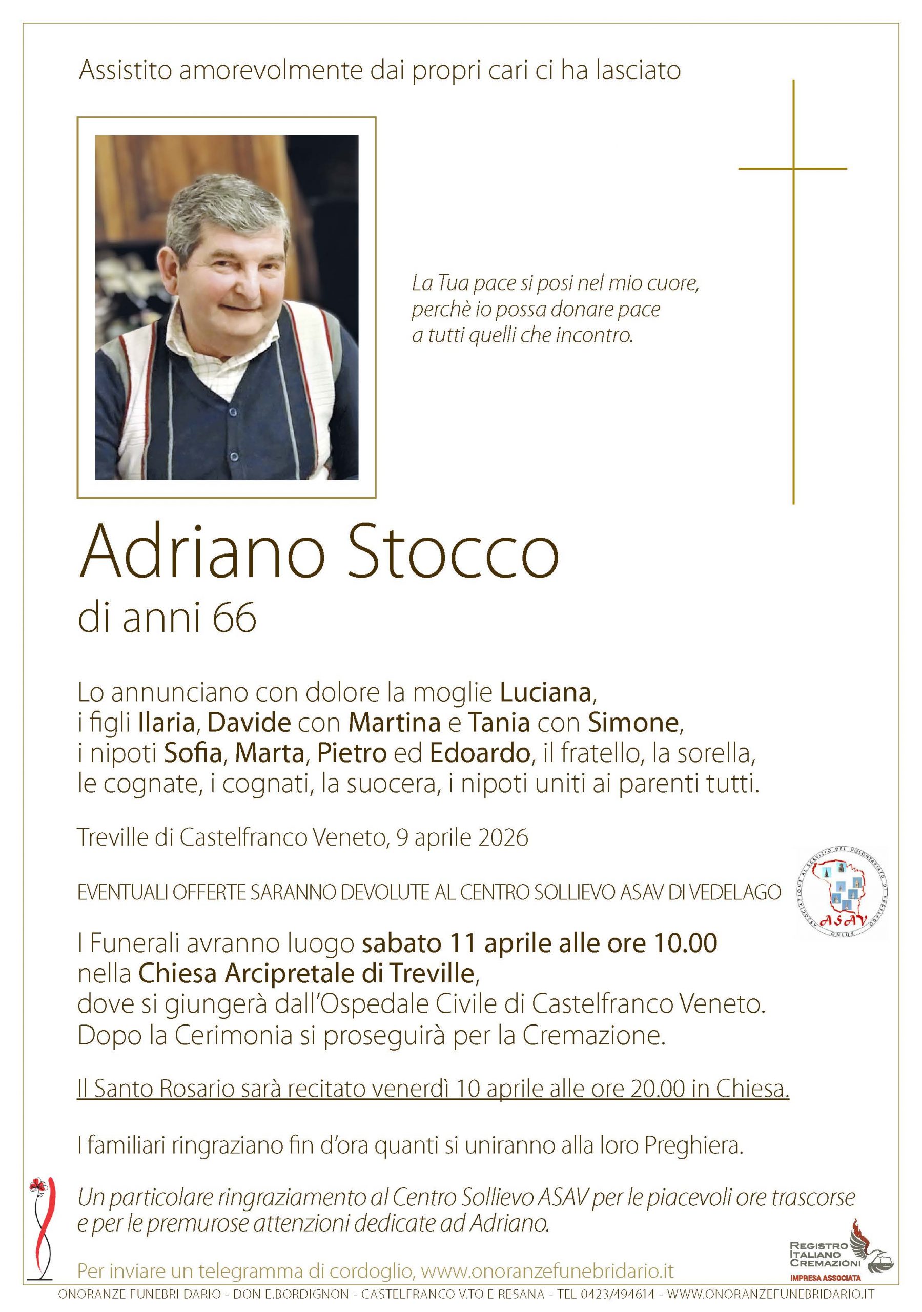 I funerali avranno luogo nella Chiesa Arcipretale di Treville |